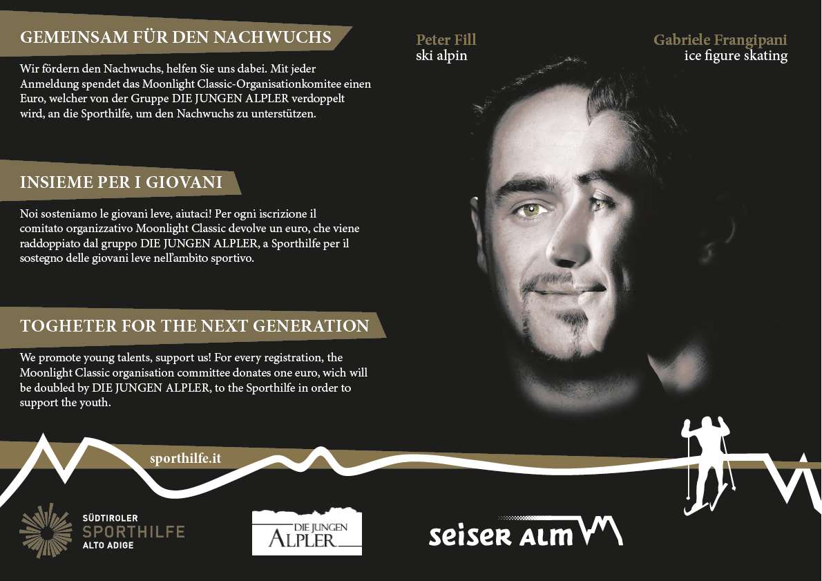 La Moonlight Classic Alpe di Siusi sostiene anche quest’anno Sporthilfe Alto Adige dando il proprio contributo ai nostri giovani talenti. Il motto è: “Insieme per le nuove leve! Sosteniamo i giovani talenti, aiutaci anche Tu!”