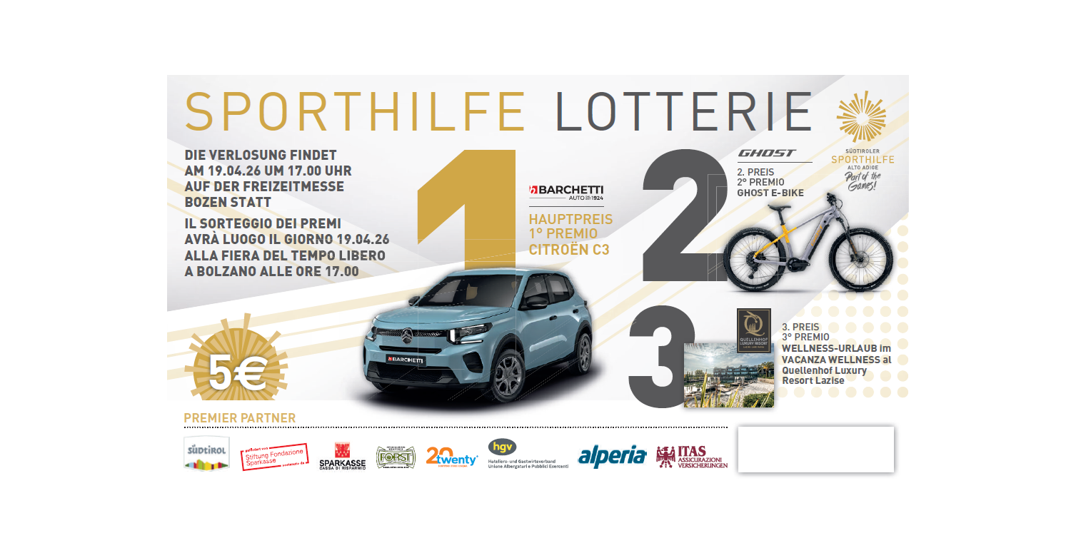 Anche quest‘anno tornano i 25 premi speciali che fanno sognare tanti partecipanti: la tradizionale Lotteria della Sporthilfe Alto Adige è ufficialmente ripartita.