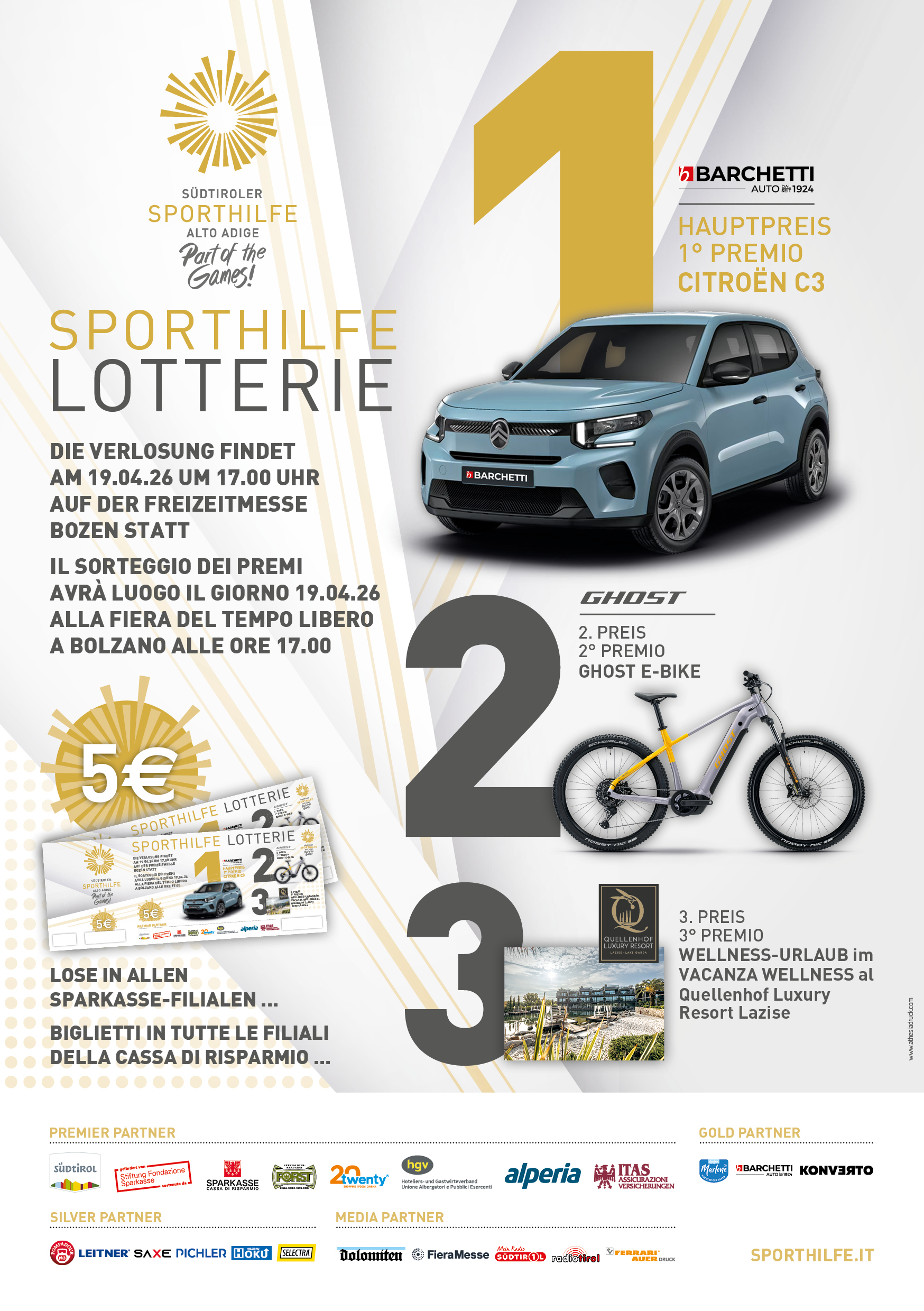 Per aziende alla ricerca di un pensiero natalizio utile, originale e solidale, i biglietti della Lotteria Sporthilfe sono la soluzione ideale: un gesto che sostiene i giovani talenti locali e che, con un pizzico di fortuna, può portare a uno dei 25 premi in palio. Tra questi spiccano il premio principale, una nuova Citroën C3, una Ghost E-Mountainbike, diverse stagionali per comprensori sciistici altoatesini, e VIP-Ticket per grandi eventi sportivi. Partecipare conviene sempre.