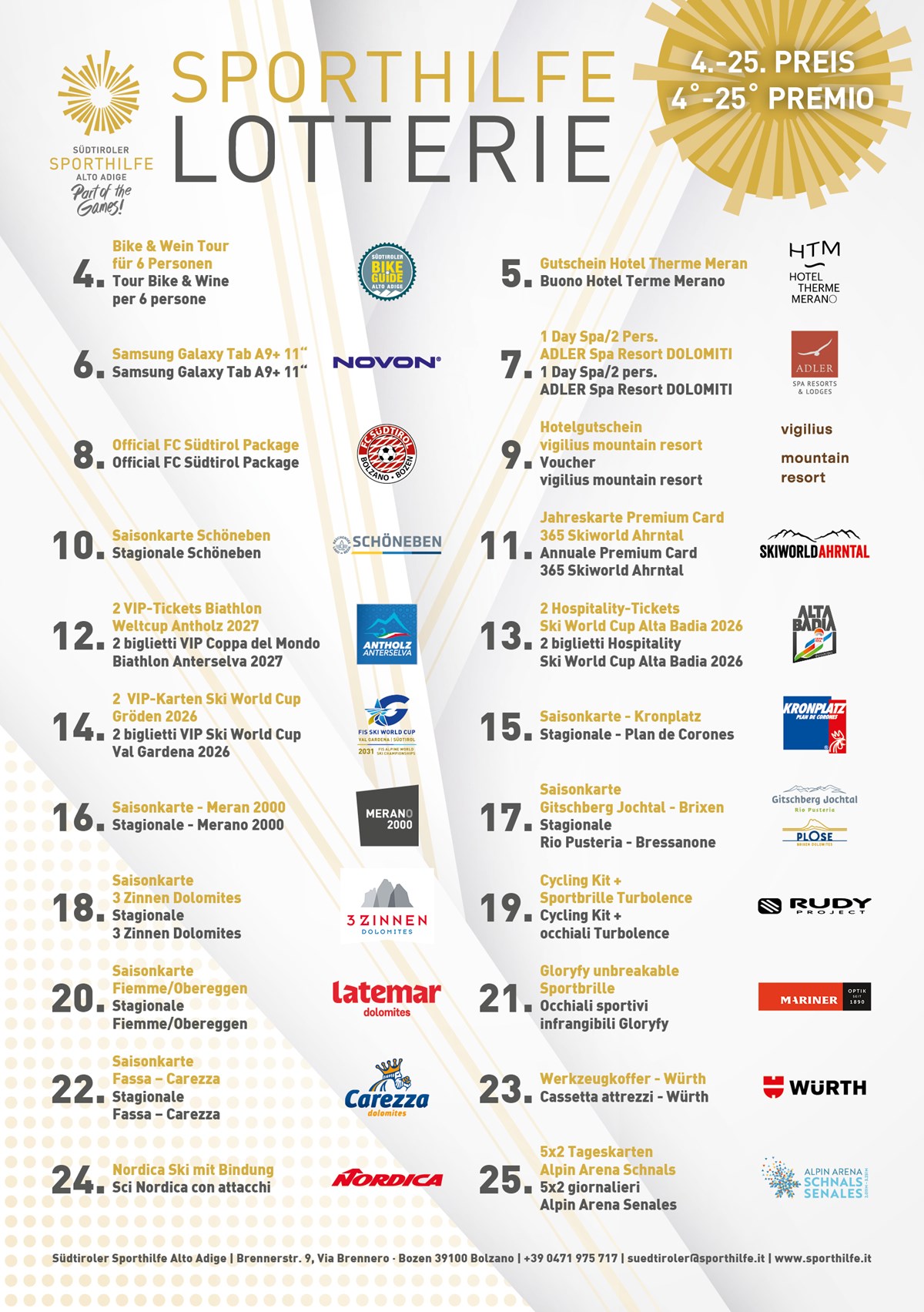 I biglietti sono stati venduti durante numerosi eventi in tutto l’Alto Adige, oltre che nelle filiali della Cassa di Risparmio di Bolzano e presso diverse aziende partner. Un sentito ringraziamento va a tutti i partner e sostenitori che, anno dopo anno, contribuiscono al successo di questa iniziativa mettendo a disposizione premi di grande valore.