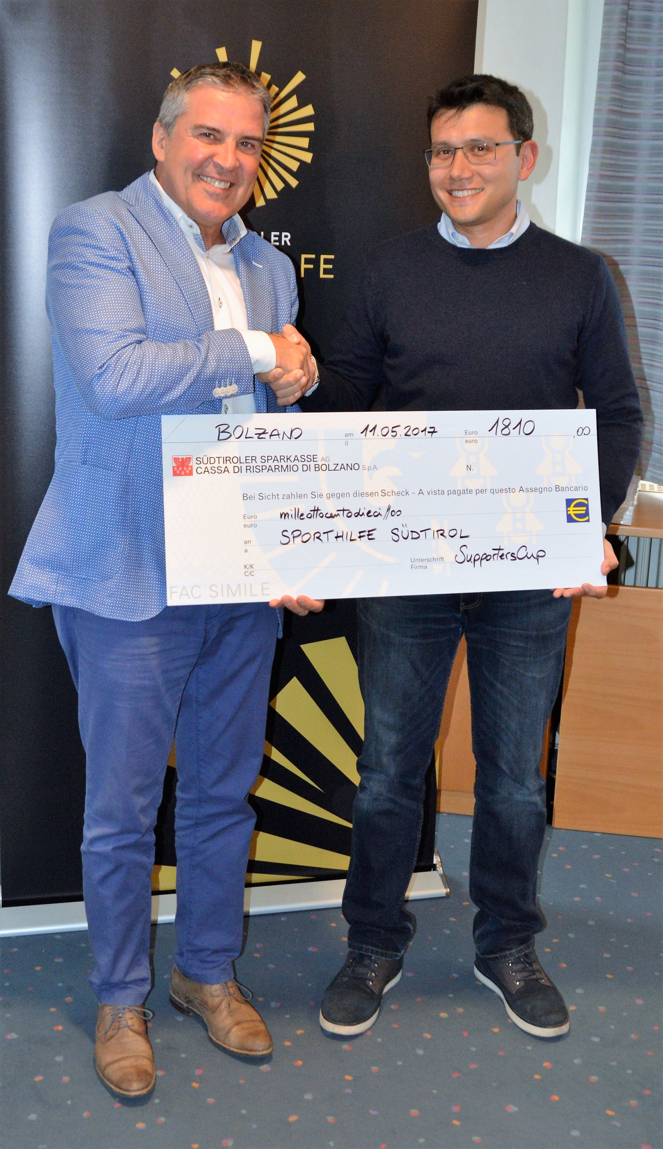 Francesco Tessari, l’ideatore ed organizzatore del SUPPORTERS CUP ha oggi consegnato presso la sede della Sporthilfe Alto Adige in presenza dell‘ assessore alla sanitá, allo sport ed al sociale Martha Stocker, il consigliere della Sporthilf…